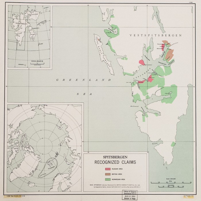 A declassified CIA map of strategic points of interest -- mining and other territorial claims by the UK, Norway, and Russia -- on Spitsbergen Island by the Central Intelligence Agency. Note the yellow stain from a piece of redaction tape which flaked off while I was handling the map. From the Library of Congress, Map Reading Room.