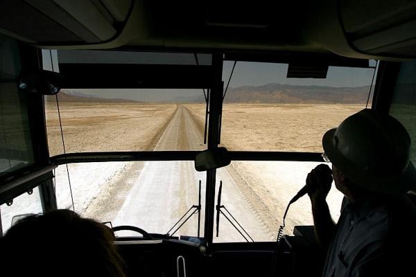 CLUI tour bus crossing Owens Lake.
