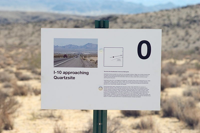 AUDC's installation for the 2004 High Desert Test Sites reproduces Quartzsite, Arizona on twenty acres of desert in Sunfair, California through an interpretive display consisting of a series of thirteen signs, each containing a scene from Quartzsite.
