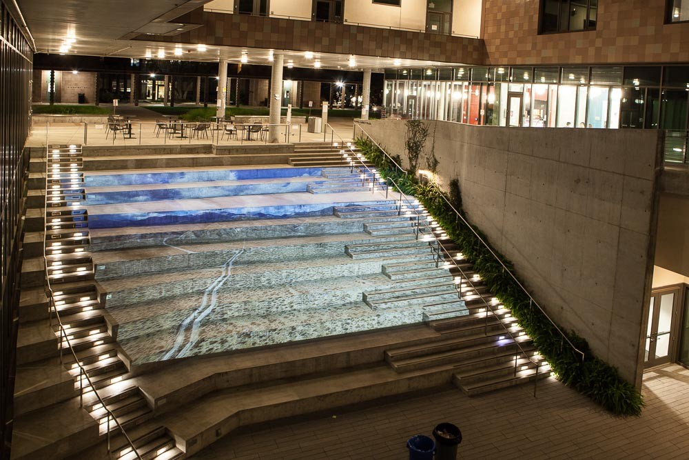 ARROWHEAD: Exhibition video projected outside during Nelson Water Series panel event Shanahan Center, Harvey Mudd College, Claremont, CA