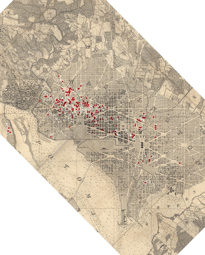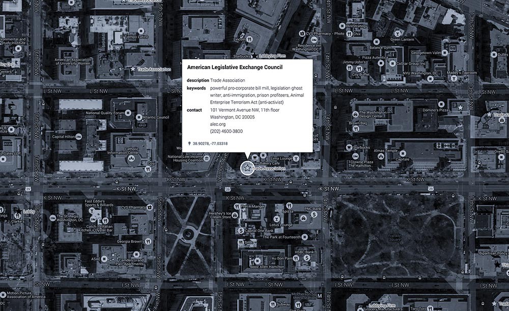 But Rowell wants us to look much further. Washington is home to a bewildering array of professional lobbies, think tanks and government relations offices that transform theoretical concepts and scientific discoveries into slogans for the public and policy packages for the bureaucrats. These entities account for the majority of stops on his itinerary. They range from the mock sublime (the Atlas Society promoting the dramatized ideology of Ayn Rand) to the patently ridiculous (the Sugar Association railing against a WHO guideline that your diet contain only 10% candy). But most of them are deadly serious: the Cato Institute, the National Security Network, the Financial Roundtable, Goldman Sachs, Google, Raytheon, Booz Allen Hamilton. These are the special interest groups that furnish the government’s expertise, and in many cases actually draft the legislation that gets passed in Washington. Open their windows, and the effective diagrams of imperial power come into view.