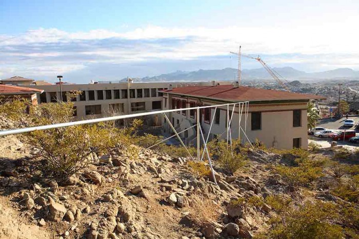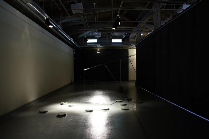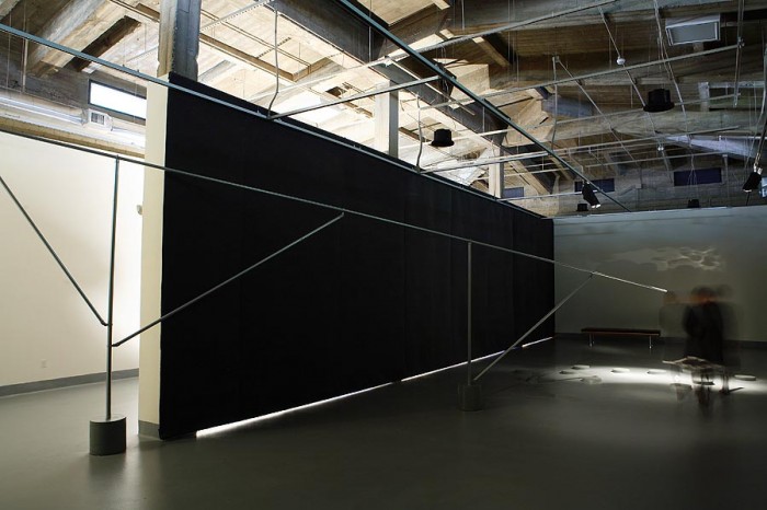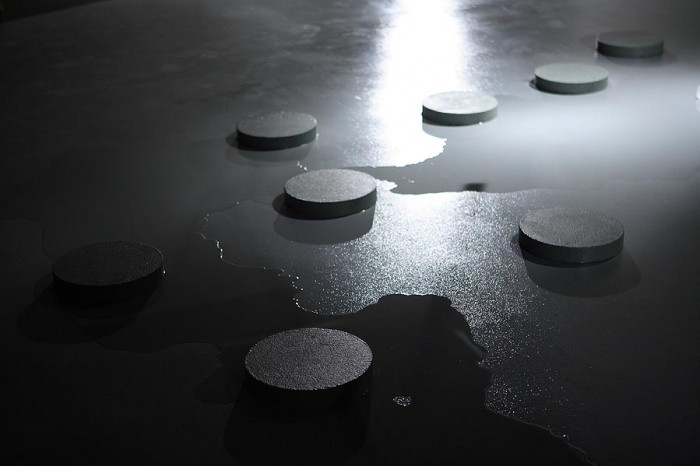 For SIMPARCH’s Hydromancy, water from the Rio Grande flows from a tank at the top of the rocky hillside outside of the Rubin Center. Gravity moves the water through three passive solar distillation units arranged in a descending formation on the hill. The stills use the energy of the sun to heat the water to the point of vaporization, the same process that forms clouds. The condensation that is formed is pure, drinkable water. It is transported down the hill and into the building via an elaborate, erected armature. The water is left to pool on the floor. That which has required human ingenuity and energy to create, lies in a puddle. The water is in its purest state – formless, still, its reflective presence spreading-accumulating at our feet. We engage with the water as a substance rather than as a commodity, relying on the weather to provide the proper conditions for flow. Contrary to the rhythms of nature, cloudy days result in very little distillation, whereas sunny days produce a regular stream.