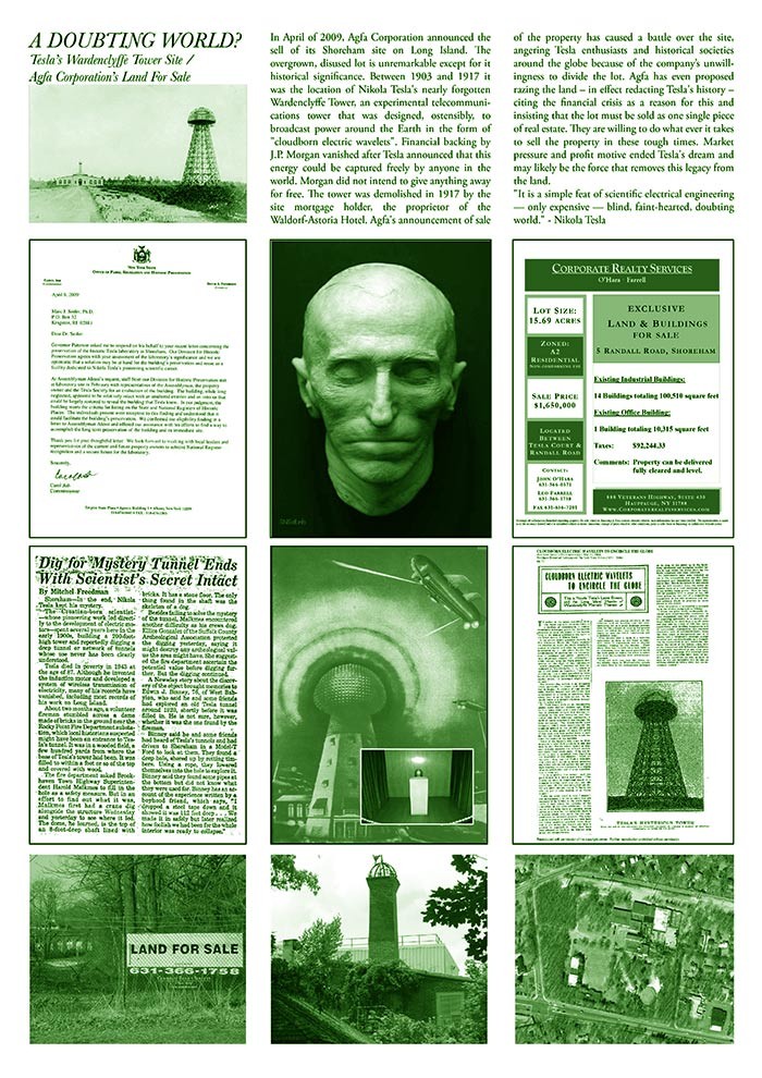 In April of 2009, Agfa Corporation announced the sell of its Shoreham site on Long Island. The overgrown, disused lot is unremarkable except for it historical significance. Between 1903 and 1917 it was the location of Nikola Tesla's nearly forgotten Wardenclyffe Tower, an experimental telecommunications tower that was designed, ostensibly, to broadcast power around the Earth in the form of "cloudborn electric wavelets". Financial backing by J.P. Morgan vanished after Tesla announced that this energy could be captured freely by anyone in the world. Morgan did not intend to give anything away for free. The tower was demolished in 1917 by the site mortgage holder, the proprietor of the Waldorf-Astoria Hotel. Agfa's announcement of sale of the property has caused a battle over the site, angering Tesla enthusiasts and historical societies around the globe because of the company’s unwillingness to divide the lot. Agfa has even proposed razing the land – in effect redacting Tesla's history – citing the financial crisis as a reason for this and insisting that the lot must be sold as one single piece of real estate. They are willing to do what ever it takes to sell the property in these tough times. Market pressure and profit motive ended Tesla's dream and may likely be the force that removes this legacy from the land.