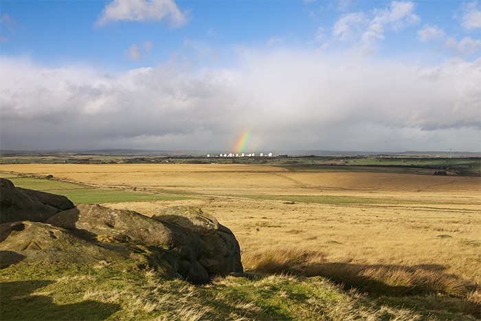 Located in the North Yorkshire Dales on sovereign British soil, RAF Menwith Hill is said to be the world’s most powerful signals intelligence satellite teleport or "listening post". Despite the RAF (Royal Air Force) affiliation, this is not a British base; the National Security Agency, National Reconnaissance Office, and National Geospatial Intelligence Agency operate this installation. Locals have been protesting this base since the 1980s when it was first revealed to be a US military intelligence site by the reporter Duncan Campbell, who exposed the secret NSA program code-named ECHELON, the precursor to global surveillance programs such as PRISM (SIGAD US-984XN), exposed by whistleblower Edward Snowden in 2013. Rainbows are caused by sunlight refracting and reflecting through water droplets in the earth's atmosphere, which sometimes behaves like a massive global prism.